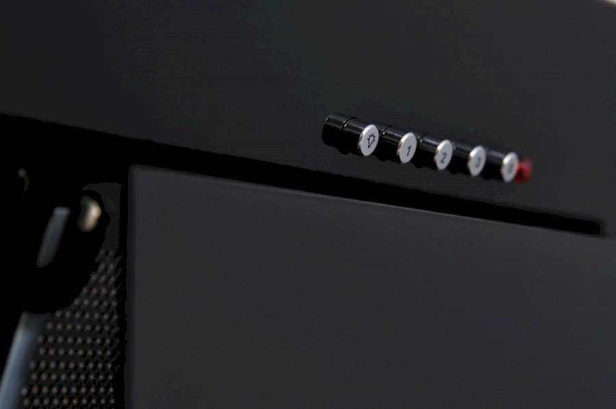 Korpus a velký šikmý panel je z černě lakovaného plechu / Středový (menší) panel je z černého skla |