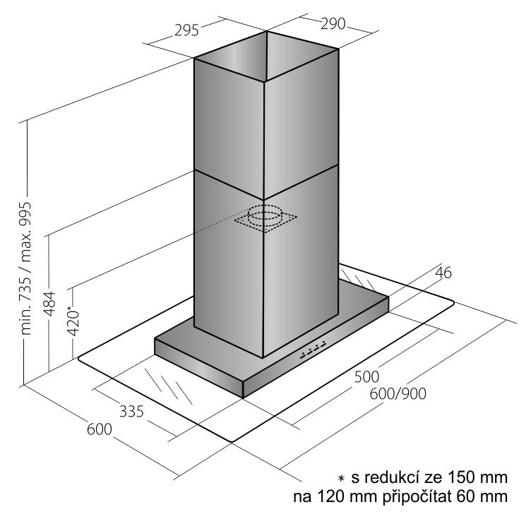 Ostrůvková digestoř, šíře 90 cm, nerez / tónované sklo, max. výkon 736 m³/h (5 Pa), hlučnost Lw 50 – 71 dB(A), 3 rychlosti + TURBO, odsávací jednotky mají individuálně vyvažovanou turbínu, motory jsou opatřené vratnými tepelnými pojistkami (při přetížení motoru vypne, po jeho vychladnutí opět sepne), kovové sendvičové tukové filtry, které lze mýt v myčce, výstupní průměr 150 mm, možnost práce v odtahovém i recirkulačním režimu, VIP výbava: úsporné LED osvětlení 4 × 2 W, elektronické dotykové ovládání s doběhovým časovačem, zdarma dálkový ovladač i s bateriemi, zdarma redukce na 120 mm a zpětná klapka, Benefity: používání dálkového ovládání usnadňuje údržbu digestoře (méně otisků na digestoři = snazší čištění), ovladač je opatřený magnetem, lze jej přichytit třeba na dveře lednice (může být snadno po ruce, nikam nezapadne)