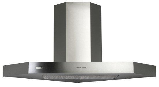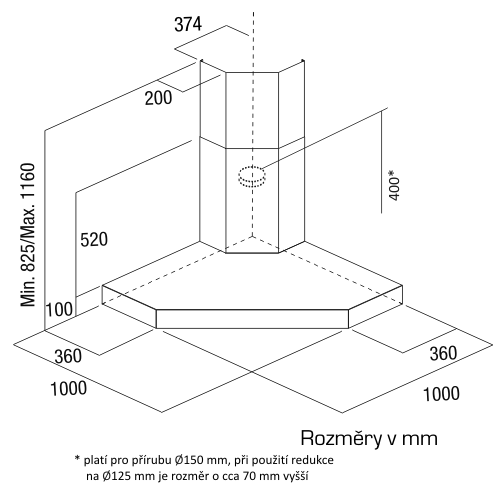 Komínová do rohu, 1000 mm, nerez, ovládání VL3 s modře prosvětlenými tlačítky, 1 motor BT3 280 W, 3 rychlosti, 850 m3/h (5 Pa), max. hlučnost Lw 67 dB, max. tlak 450 Pa, 15 min. časovač, LED světla 2 × 4 W.