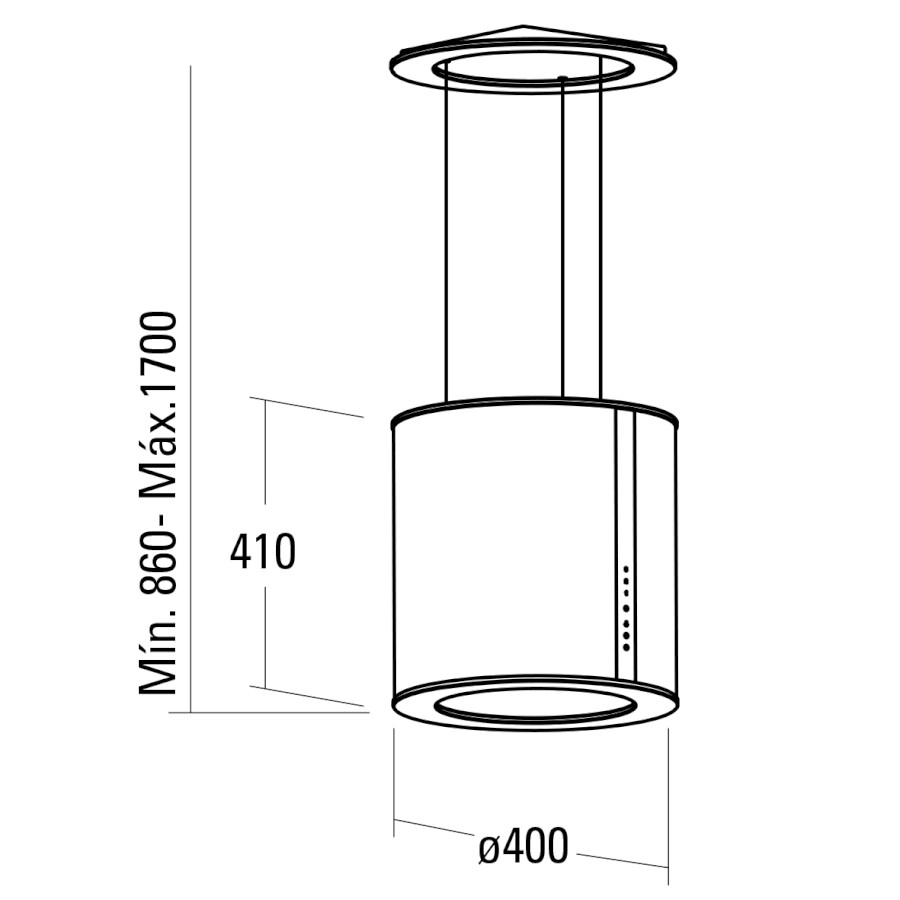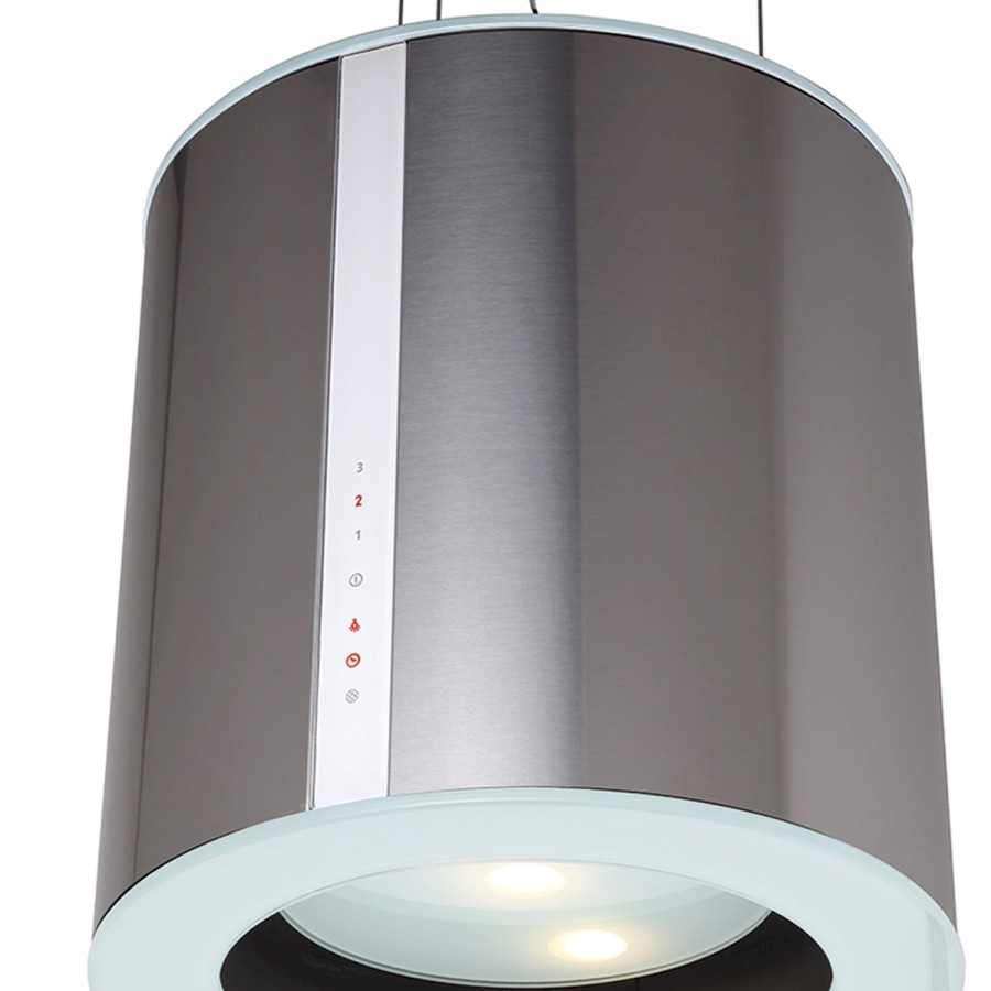 Ostrůvková lustrová digestoř, šíře 40 cm, nerez/bílé sklo, max. výkon 645 m³/h (5 Pa), hlučnost Lw 48 – 63 dB(A), 3 rychlosti, kovové sendvičové tukové filtry, které lze mýt v myčce, v myčce lze mýt i uhlíkový pachový filtr, digestoř určená pro provoz v recirkulačním režimu, úsporné LED osvětlení 3 × 3,5 W s regulací jasu, dotykové ovládání TC3V s doběhovým časovačem