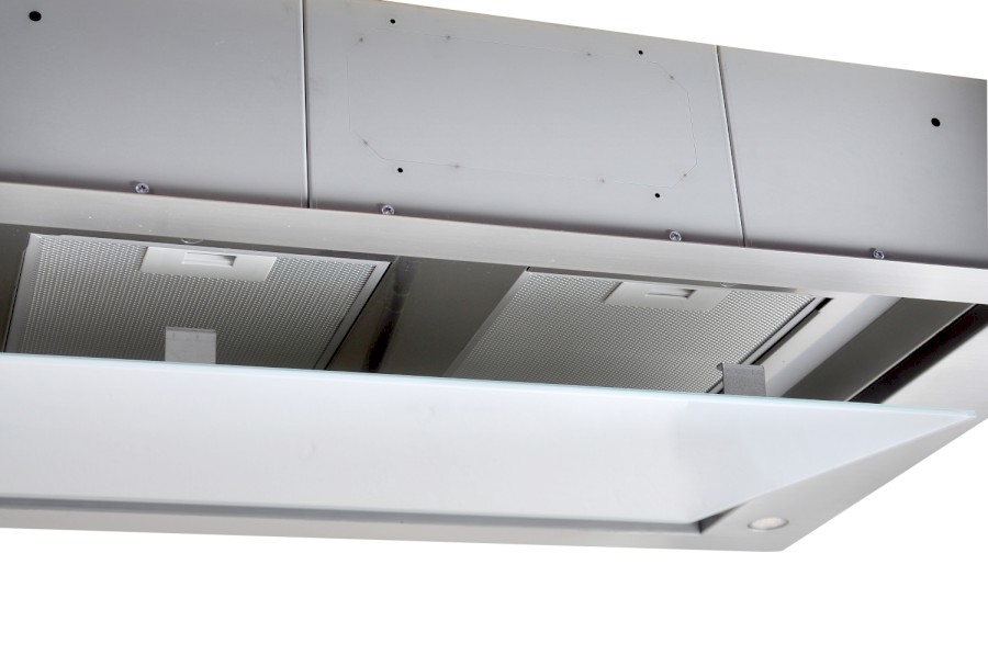 Stropní digestoř s externím motorem, šíře 90 cm, nerez / bílé sklo, max. výkon 822 m³/h (5 Pa), hlučnost Lw 51 – 69 dB(A), 3 rychlosti + TURBO, odsávací jednotky mají individuálně vyvažovanou turbínu, motory jsou opatřené vratnými tepelnými pojistkami (při přetížení motoru vypne, po jeho vychladnutí opět sepne), kovové sendvičové tukové filtry, které lze mýt v myčce, výstupní průměr 150 mm, možnost práce pouze v odtahovém režimu, VIP výbava: úsporné LED osvětlení 4 × 2 W, elektronické dálkové ovládání, zdarma dálkový ovladač i s bateriemi, zdarma přiloženy montážní konzole, výdechové hrdlo a propojovací kabel 10 m, Benefity: stropní digestoř je skrytá ve stropním podhledu a dává tak vyniknout ostatnímu vybavení kuchyně, externí motor lze umístit i mimo kuchyň a snížit tak provozní hlučnost