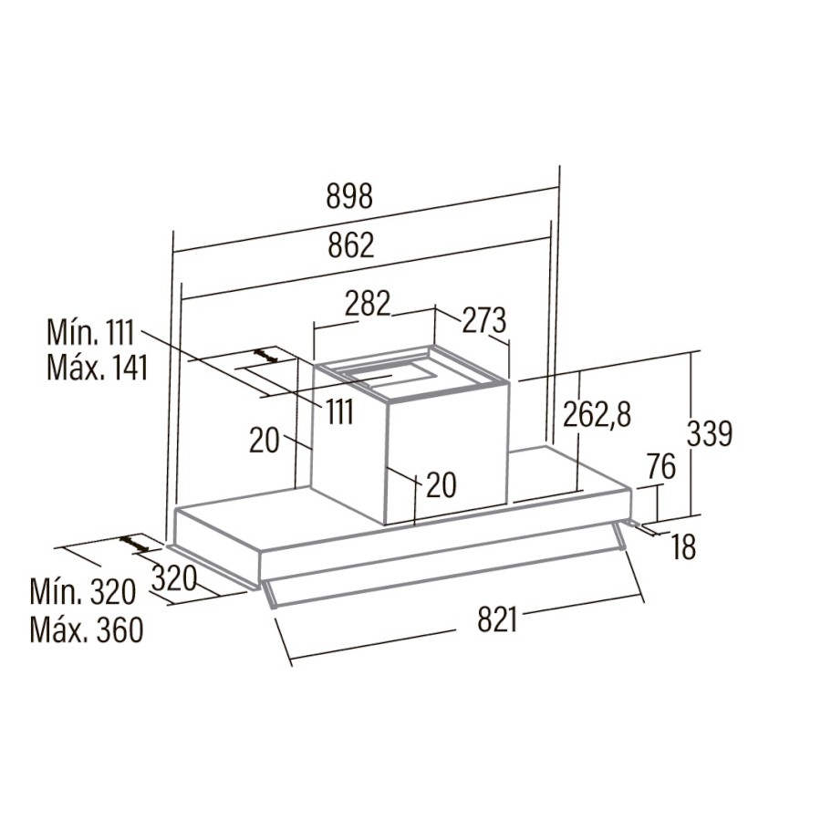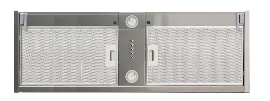 Neviditelná vestavná digestoř, 900 mm, nerez / sklo, mechanické tlačítkové ovládání, 3 rychlosti, max. výkon 645 m³/h (5 Pa), hlučnost Lw 56 – 70 dB(A), max. tlak 430 Pa, kovové sendvičové tukové filtry, které lze mýt v myčce, výstupní průměr 150 mm, možnost práce v odtahovém i recirkulačním režimu, snadná montáž, Výbava: úsporné LED osvětlení 2 × 4 W, výklopné skleněné stínítko pro zvětšení plochy odsávání a pro ochranu dvířek skříňky.
