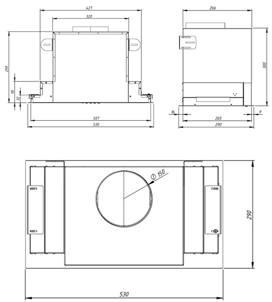 Pro výrobu skříňky je směrodatný rozměrový nákres a údaje v něm uvedené. Fotografie digestoří jsou ilustrační.