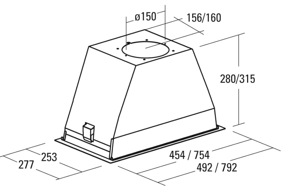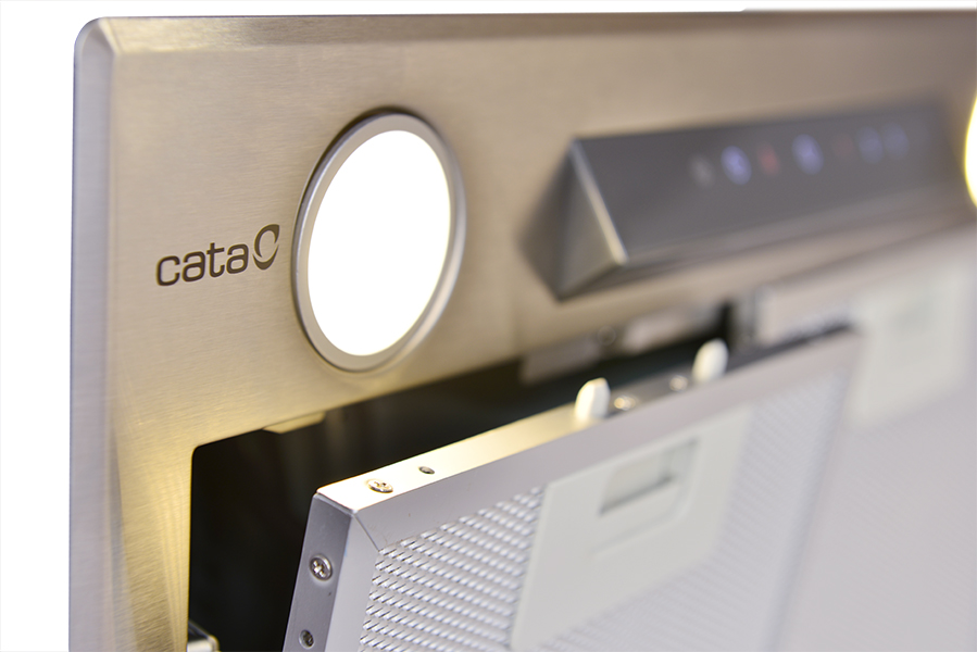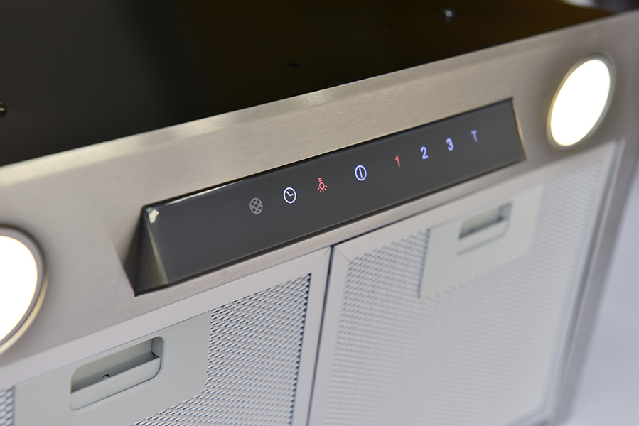 Vestavná, 450 mm (do 600 mm skříňky), nerez, 1 motor BT3 280 W, 3 rychlosti, 820 m³/h (5 Pa), max. tlak 405 Pa, max. hlučnost Lw 67 dB, 15 min. časovač, LED světla s nastavitelnou intenzitou jasu.