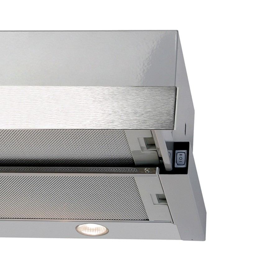 Vestavná výsuvná, 600 mm, nerez lišta s povrchem DurAlum, 1 motor 80 W, 2 rychlosti, 340 m3/h (15 Pa), max. tlak 194 Pa, max. hlučnost Lw 55 dB.