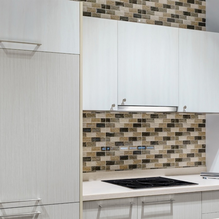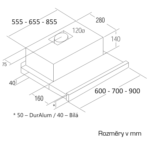 Vestavná výsuvná, 900 mm, nerez lišta s povrchem DurAlum, 1 motor 80 W, 2 rychlosti, 340 m3/h (15 Pa), max. tlak 194 Pa, max. hlučnost Lw 55 dB.