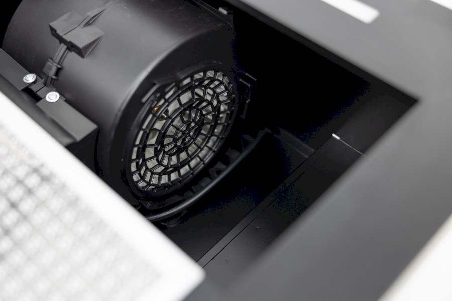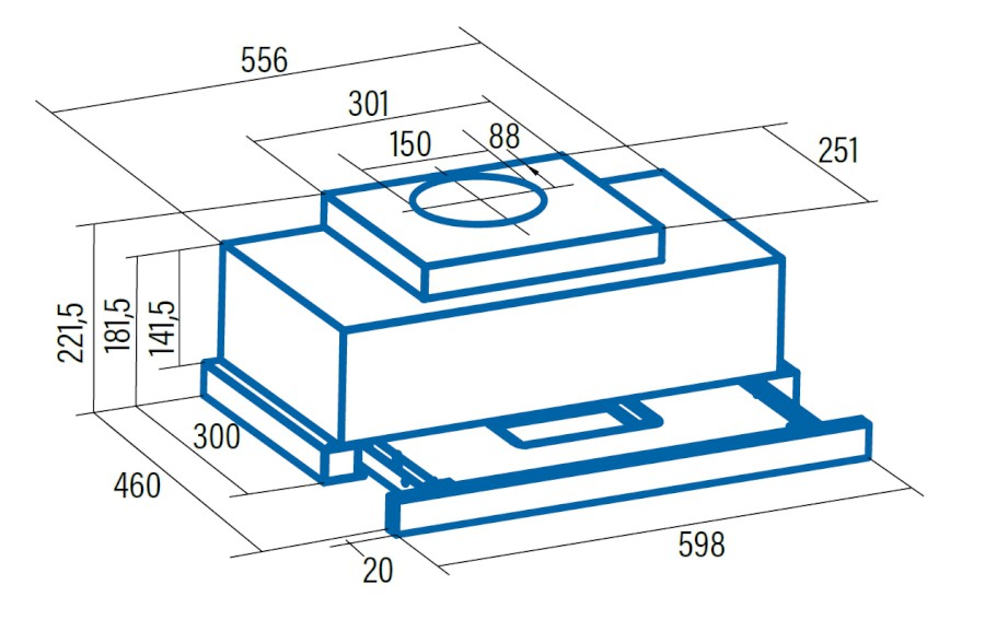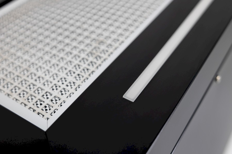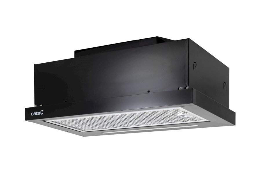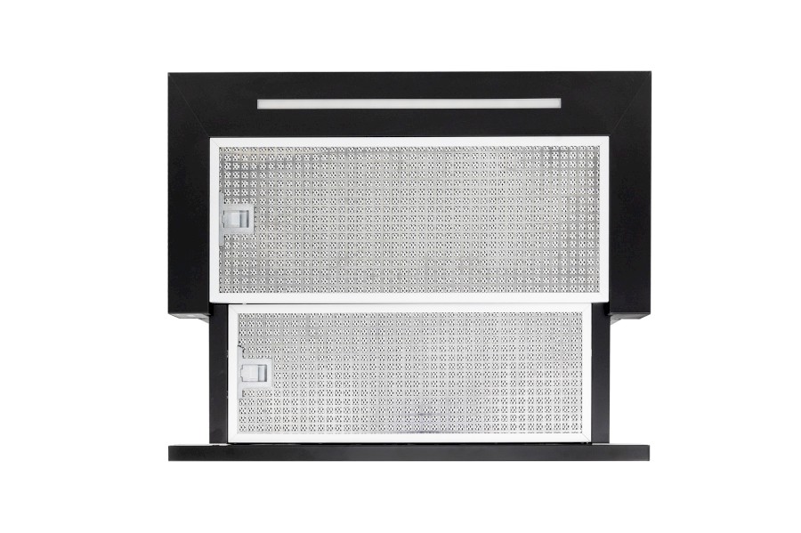 Vestavná výsuvná digestoř s bezkartáčovým motorem: šíře 600 mm, černá, 1 motor T1DC 90 W, 5 rychlostí + TURBO, 575 m3/h (5 Pa), max. tlak 300 Pa, max. hlučnost Lw 63 dB.