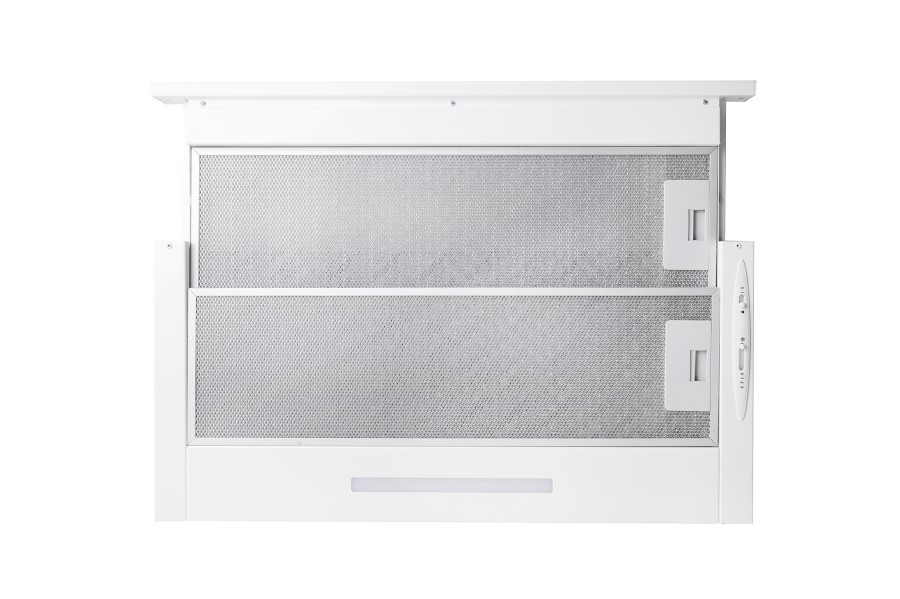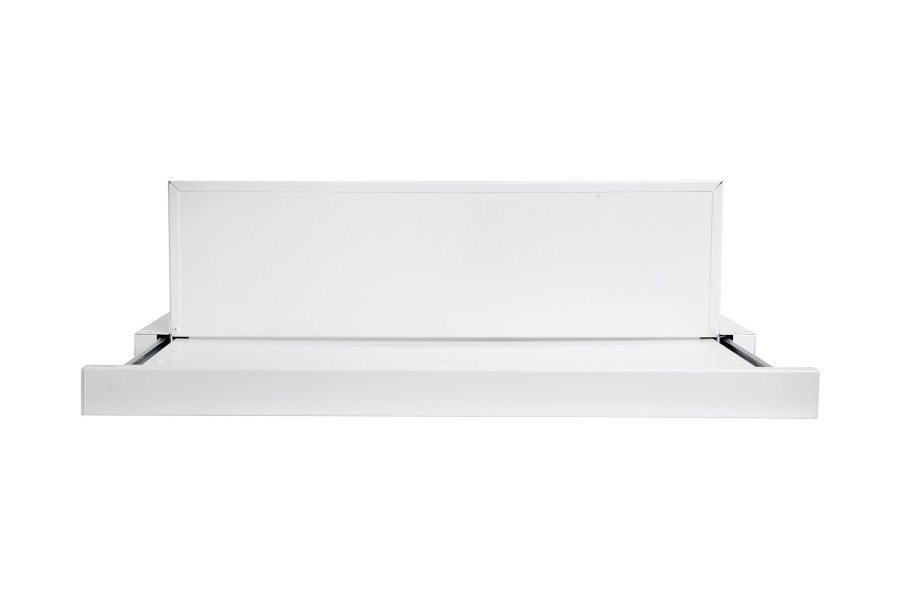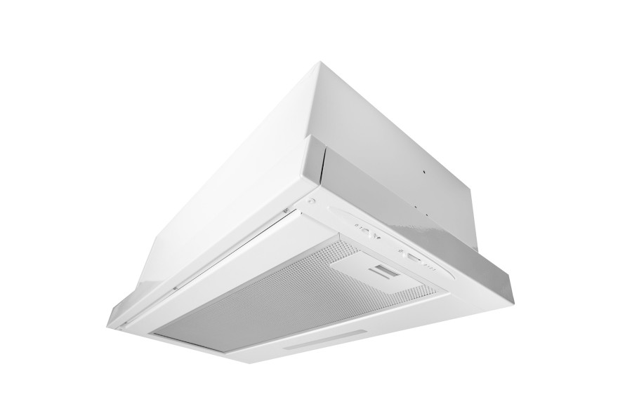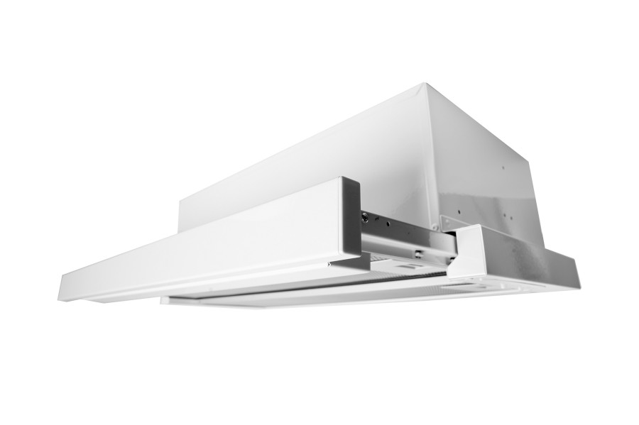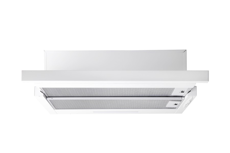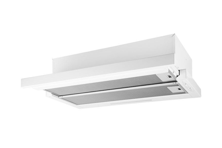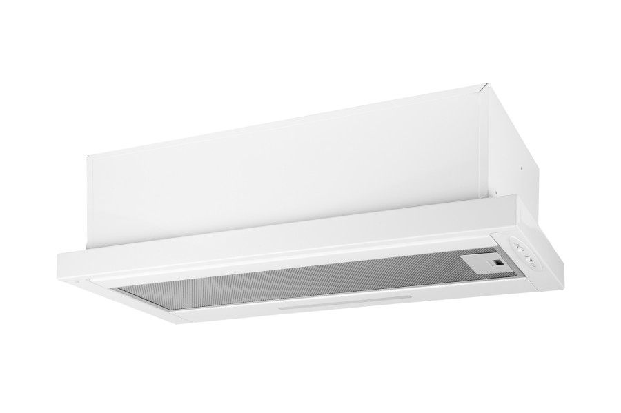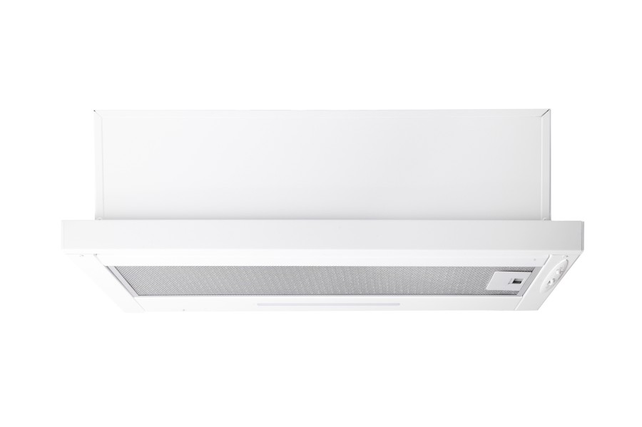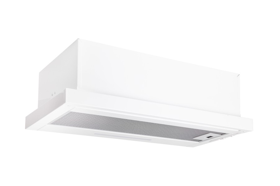 Vestavná digestoř výsuvná, jediná na trhu s odtahem dozadu nebo nahoru (oba 120 mm), šíře 60 cm, bílá, max. výkon 338 m³/h (15 Pa), hlučnost Lw 56 – 71 dB(A), 3 rychlosti, odsávací jednotky mají individuálně vyvažovanou turbínu, motory jsou opatřené vratnými tepelnými pojistkami (při přetížení motoru vypne, po jeho vychladnutí opět sepne), mechanické posuvné ovládání, kovové sendvičové tukové filtry, které lze mýt v myčce, možnost práce v odtahovém i recirkulačním režimu, Výbava: úsporné LED osvětlení 1 × 2,8 W (LED pásek), zdarma zpětná klapka