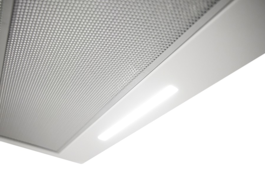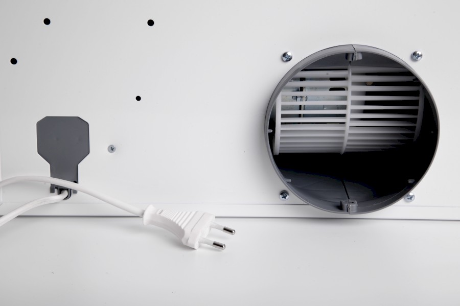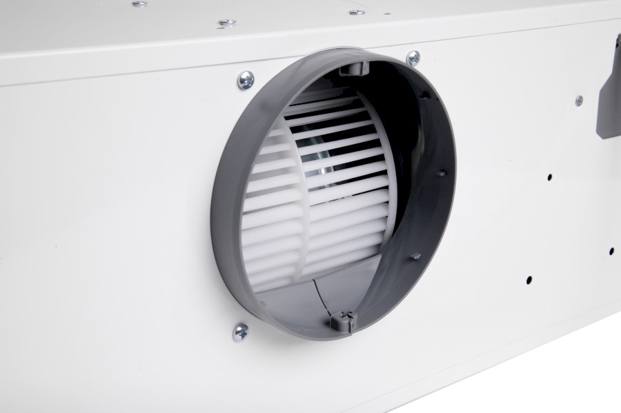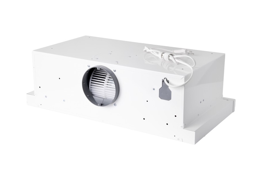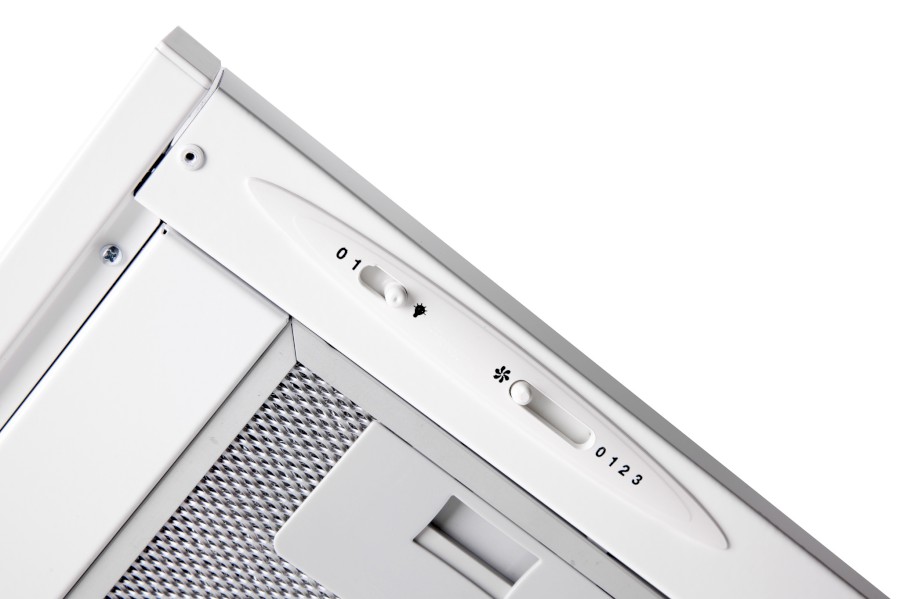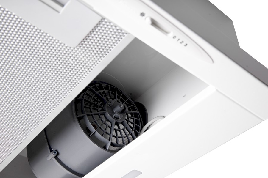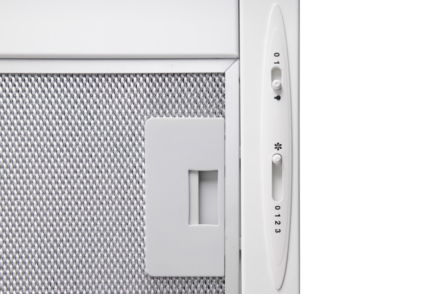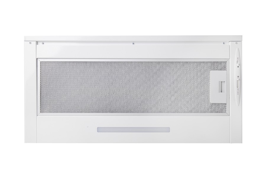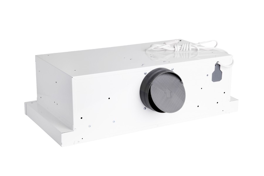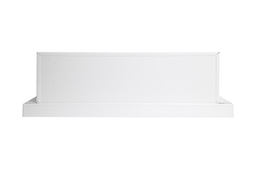 Vestavná digestoř výsuvná, jediná na trhu s odtahem dozadu nebo nahoru (oba 120 mm), šíře 60 cm, bílá, max. výkon 338 m³/h (15 Pa), hlučnost Lw 56 – 71 dB(A), 3 rychlosti, odsávací jednotky mají individuálně vyvažovanou turbínu, motory jsou opatřené vratnými tepelnými pojistkami (při přetížení motoru vypne, po jeho vychladnutí opět sepne), mechanické posuvné ovládání, kovové sendvičové tukové filtry, které lze mýt v myčce, možnost práce v odtahovém i recirkulačním režimu, Výbava: úsporné LED osvětlení 1 × 2,8 W (LED pásek), zdarma zpětná klapka