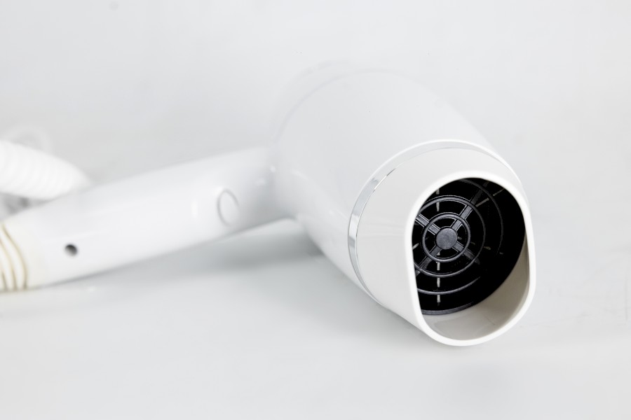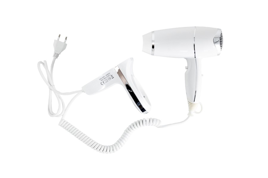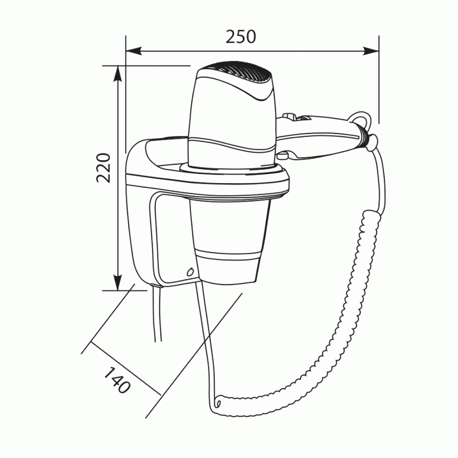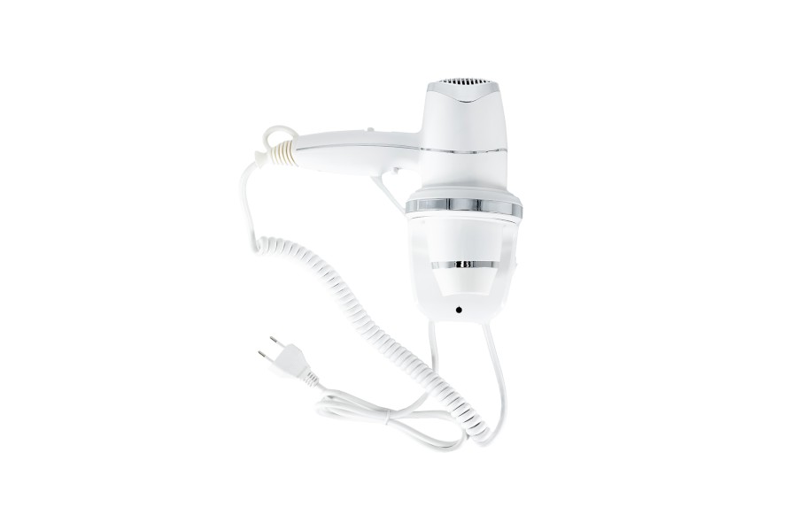 Hotelový fén s montáží na zeď, 3 rychlosti, 220 V - 240 V / 50 - 60 Hz, příkon 1.800 W, přepínač rychlostí a spouštěcí tlačítko na rukojeti, hlavní vypínač na stojánku, materiál ABS, bezpečnost CLASS II, dvojitá izolace, rozměry 220 mm výška × 250 mm šířka × 140 mm hloubka, hmotnost 0,82 kg