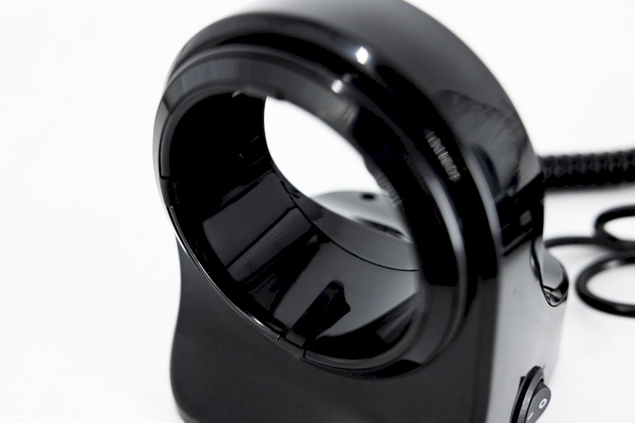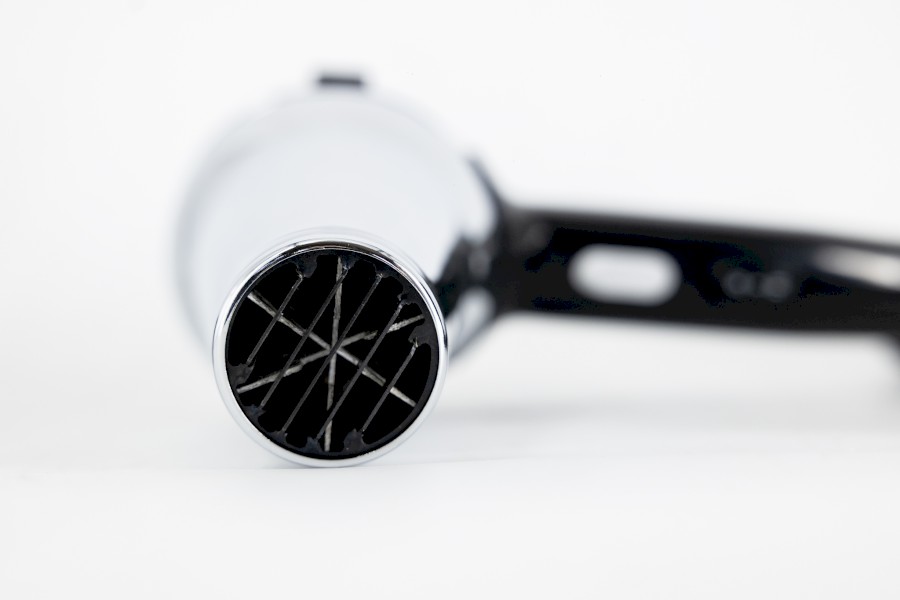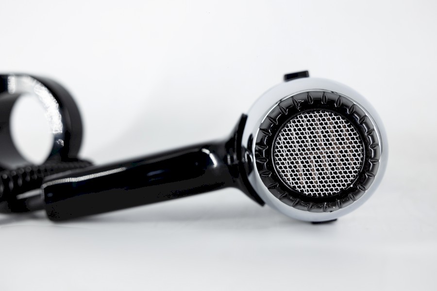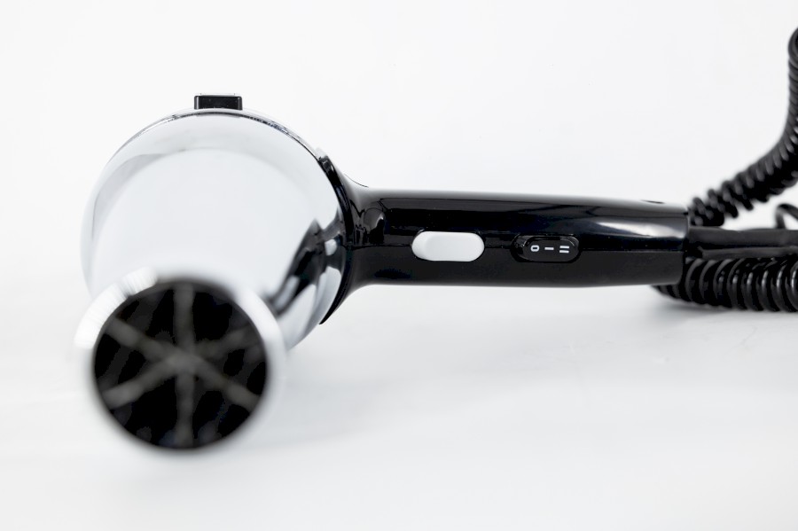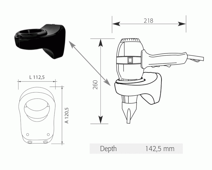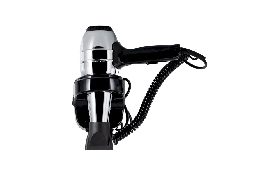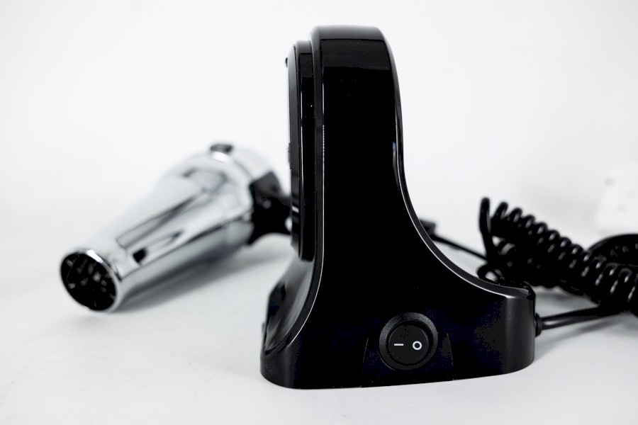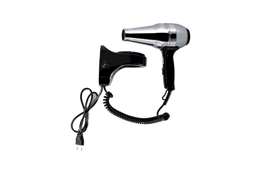 Hotelový fén s montáží na zeď, 2 rychlosti, 220 V - 240 V / 50 - 60 Hz, 1.300 W, přepínač rychlostí a topného výkonu na rukojeti, hlavní vypínač na stojánku, materiál ABS + nerez, bezpečnost CLASS II, dvojitá izolace, rozměry 260 mm výška × 218 mm šířka × 102,5 mm hloubka, hmotnost 0,8 kg