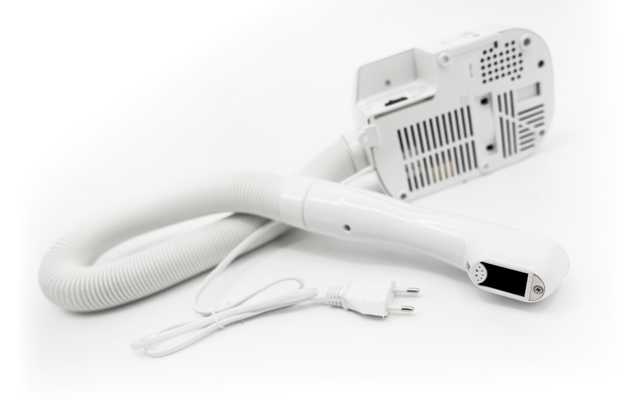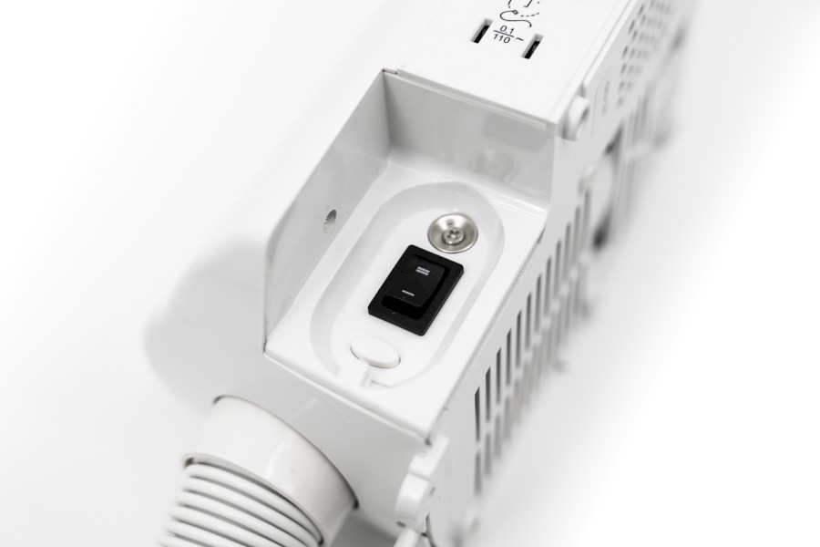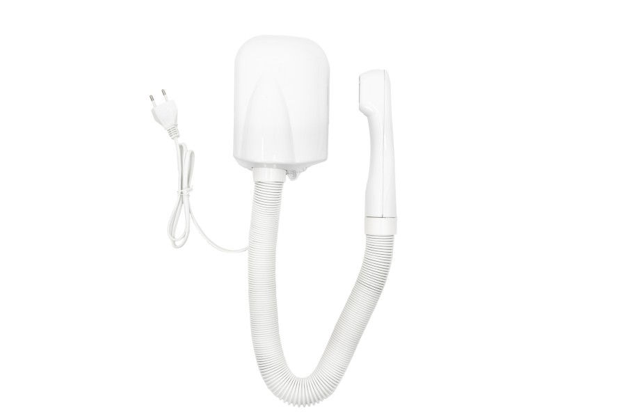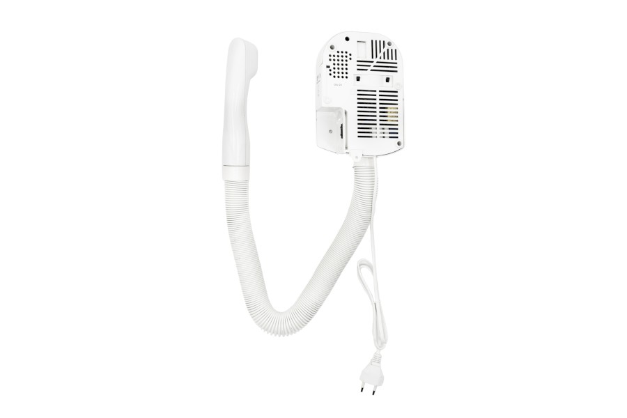 Hotelový fén s montáží na zeď a se zásuvkou pro holicí strojek (EU+USA, 115/230 V, omezovač odebíraného proudu - umožňuje provoz jen malých spotřebičů, jako jsou holicí strojky, nabíječky mobilních telefonů, ...), 2 rychlosti, 220 V - 240 V / 50 - 60 Hz, max. příkon 400 W (1. rychlost) / 700 W (2. rychlost), přepínač rychlosti na hlavní jednotce na zdi, automatické spuštění sejmutím fénovací hadice z magnetického držáku, bezpečnost CLASS II, dvojitá izolace, automatické vypnutí, tepelná pojistka a ochranný termostat, výkonný AC motor pro dlouhou životnost, tichý provoz, rozměry 180 mm výška × 125 mm šířka × 90 mm hloubka, hmotnost 1 kg, spodní hrana těla fénu musí být ve výšce min. 155 cm nad podlahou